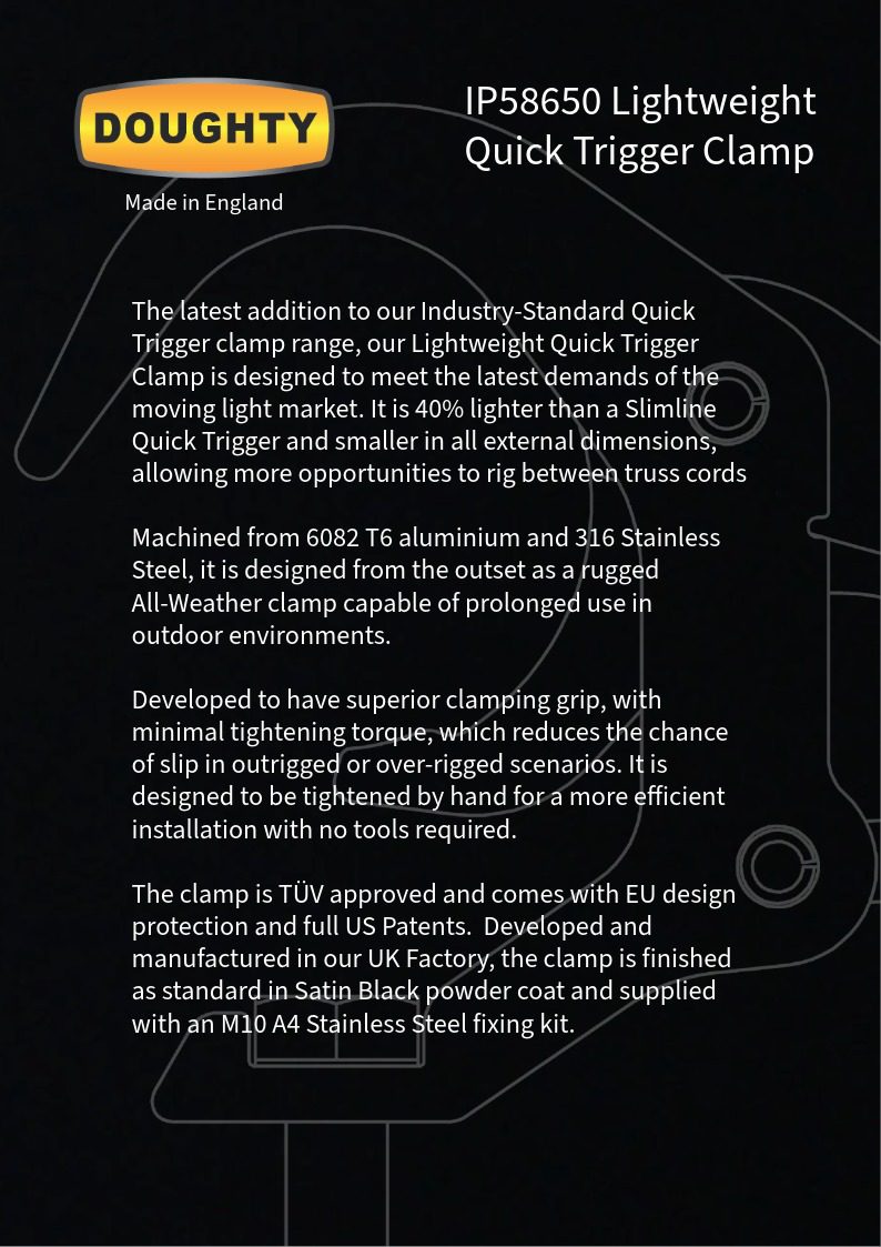 I am delighted that Doughty has won the Plasa Awards for Innovation this year. The new Light Weight Quick Trigger has been very well received during the show. Our customers were very impressed with its strong grip, also being IP rated this makes it perfect for all weather applications. I believe it is a great addition to our wide range of clamps and couplers.”