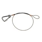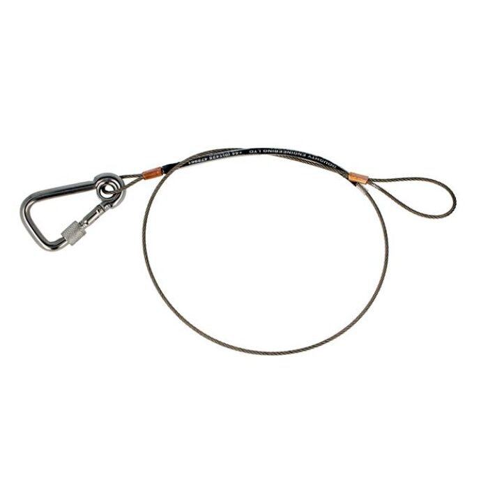 It is 2mm x 600mm long, with soft loops at each end and comes with an M6 screwgate hook at one end. A general purpose safety bond suitable for smaller fixtures.