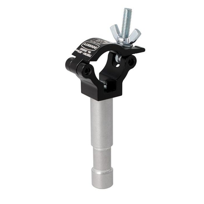 A high tensile extruded aluminium clamp that is suitable for 25mm (1″) diameter tubes. It has a WLL of 100Kg and is 21mm wide, factory fitted with a 16mm diameter spigot. Ideal for decorative trussing as it will not damage the cords. Available in polished silver or powder coated black.