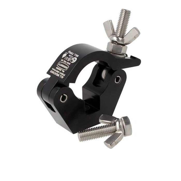 Ideal for use on trussing as it will not damage the cords. Supplied with a sachet of Copper Grease to prevent Stainless threads galling, and available in a powder coated black finish.