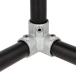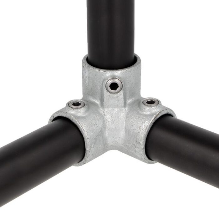 A galvanised, malleable iron fitting designed to provide a three way 90 degree corner.
