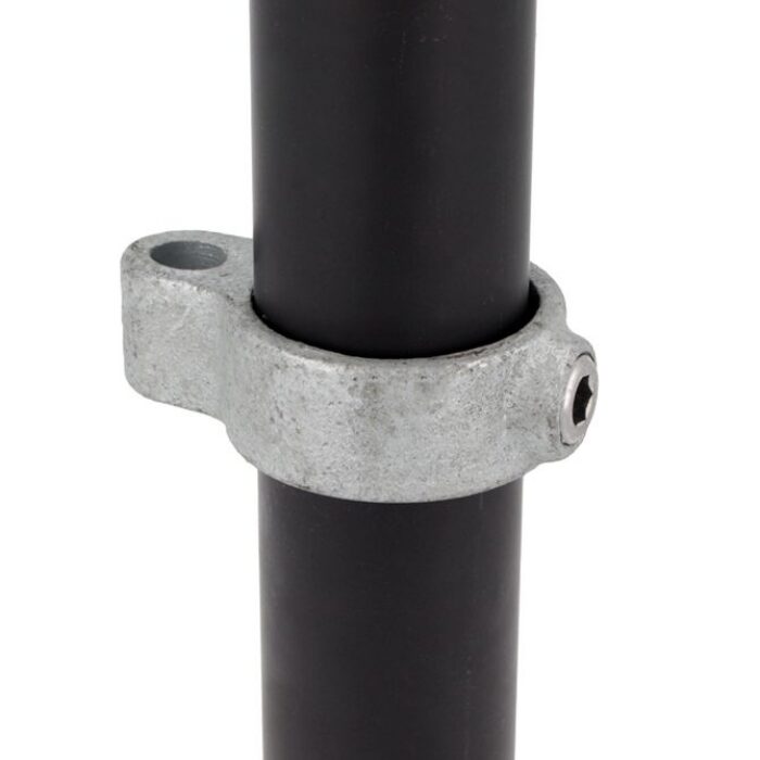 A galvanised, malleable iron fitting, designed to be used as the female section of a two part gate hinge.
