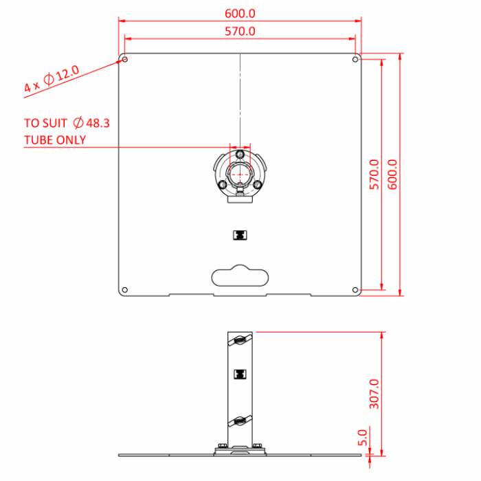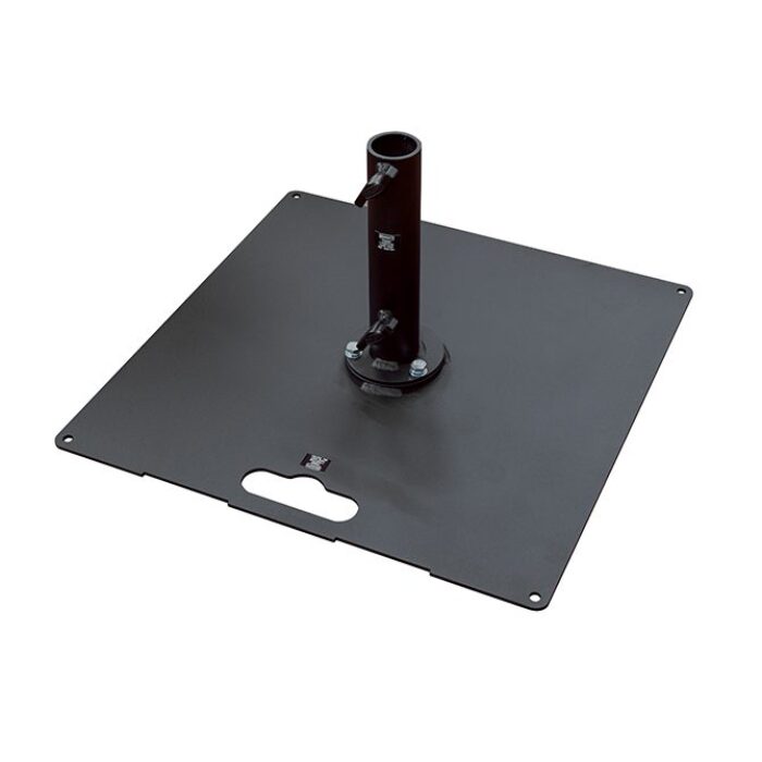 A mild steel floor plate which provides the means to support a 48.3mm vertical tube or scaffold pole and is ideal for side lighting. It is supplied with a removable receiver for ease of storage and transportation which can be bolted in the centre of the base plate.